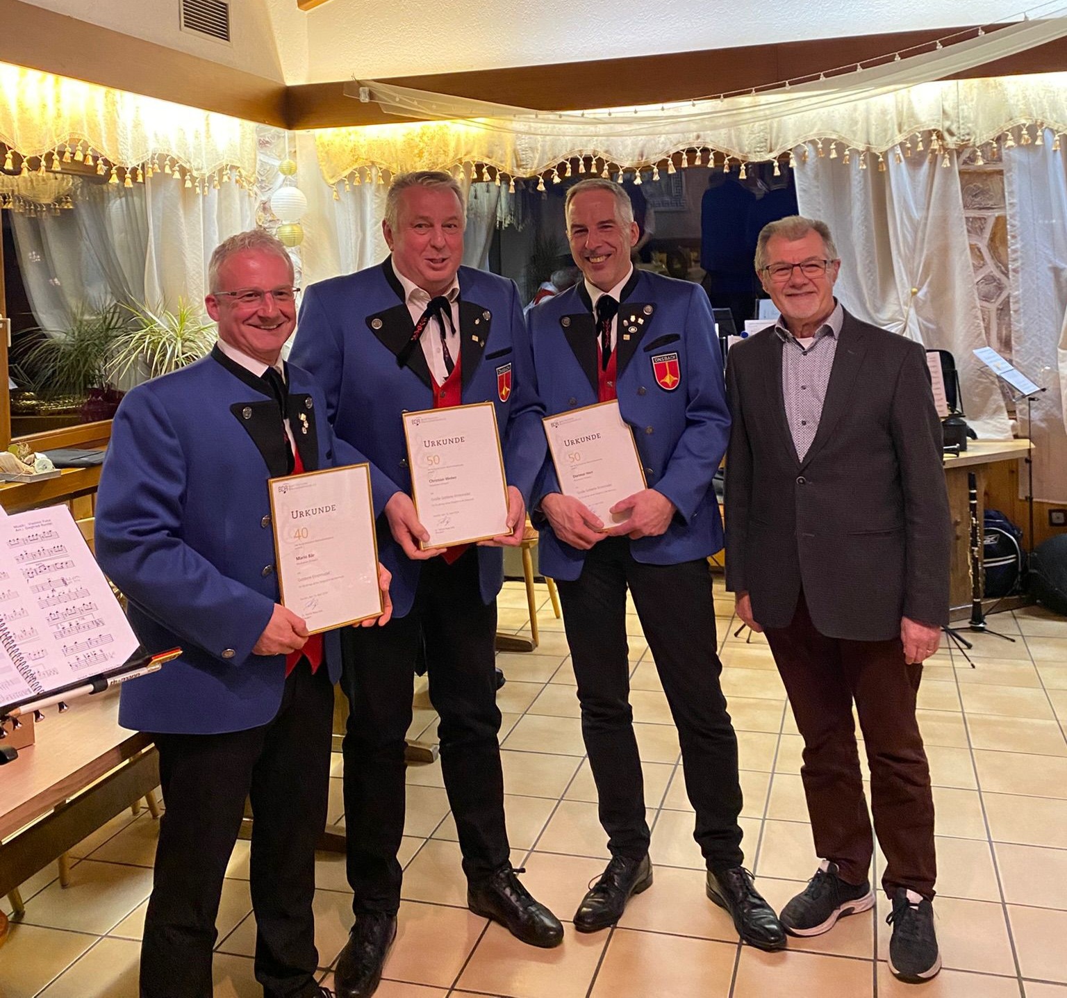 Für ein halbes Jahrhundert Tätigkeit in der Blasmusik wurden Dietmar Herr und Christian Weber ausgezeichnet. Die Ehrung wurde durch den Vertreter des Acher-Renchtal-Musikverbandes Klaus-Peter Mungenast vorgenommen, der das langjährige Wirken der beiden würdigte. Dietmar engagierte sich über Jahrzehnte hinweg in zahlreichen Funktionen innerhalb der Vorstandschaft und prägte die Vereinsarbeit nachhaltig. Auch Christian hat den Verein als langjähriger erster Trompeter sowie als 1. Vorsitzender maßgeblich mitgestaltet und unterstützt ihn bis heute in vielfältiger Weise.
