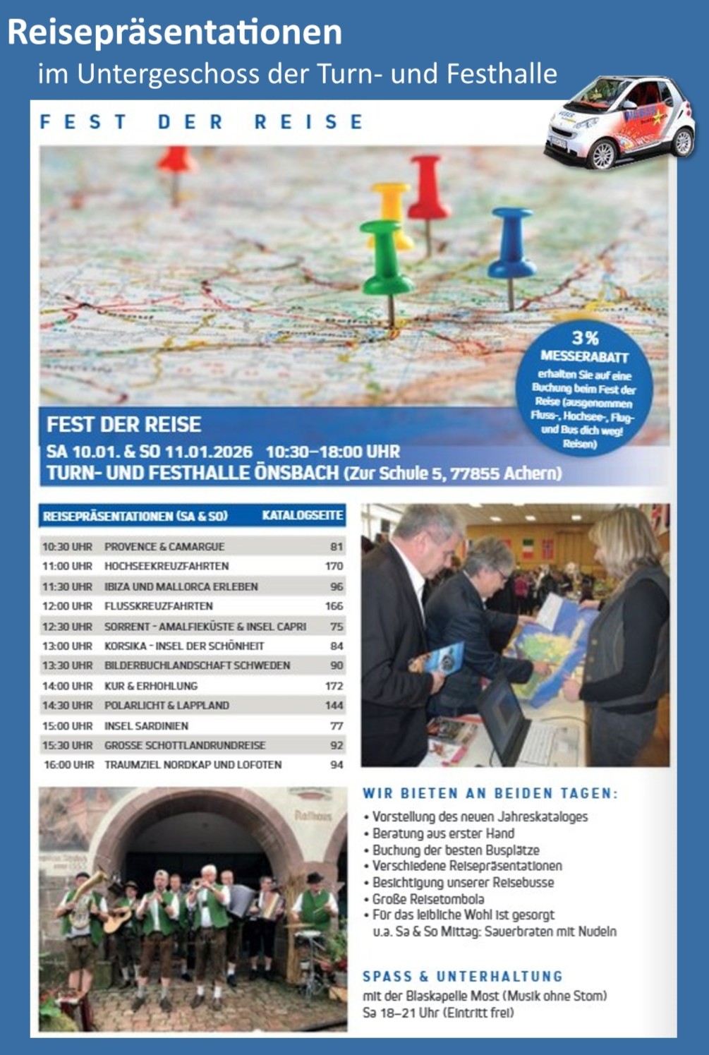 An diesem Wochenende lädt unser örtliches Busunternehmen wieder zum „Fest der Reise“ in die Önsbacher Turn- und Festhalle ein. An beiden Tagen dreht sich alles um Reiselust und Urlaubsinspiration: Spannende Präsentationen, informative Vorträge und zahlreiche Aussteller machen Lust auf die nächste Auszeit. Für das leibliche Wohl ist ebenfalls bestens gesorgt. Die Bläserjugend des Musikvereins Önsbach verwöhnt die Besucherinnen und Besucher mit Sauerbraten, Wurstsalat, Vespertellern, Bockwurst sowie einer großen Auswahl an selbstgebackenen Kuchen. Ein besonderes Highlight erwartet die Gäste am Samstagabend: Die Bonndorfer Blaskapelle MOSTMusik ohne Strom – sorgt mit Akkordeon, Gitarre, Trompete, Bariton, Klarinette und Schlagzeug für ein mitreißendes und außergewöhnliches (blas-)musikalisches Erlebnis.